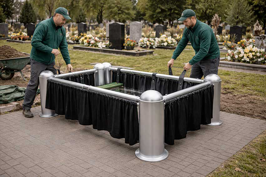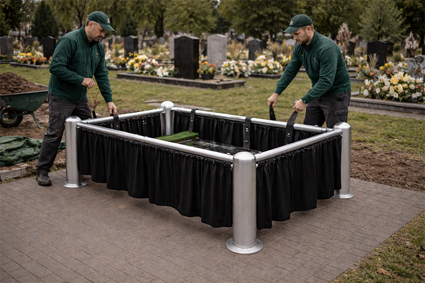 Of all the innovations that have reached Polish funeral homes over the past decade, lowering devices are the one that most profoundly changes the character of the ceremony itself. Traditional coffin lowering required several people, ropes, and considerable physical effort. The entire process carried the risk of uneven descent, involuntary jerking, and loss of control over the pace. A modern funeral lowering device eliminates these problems radically.