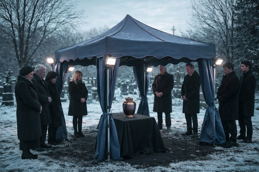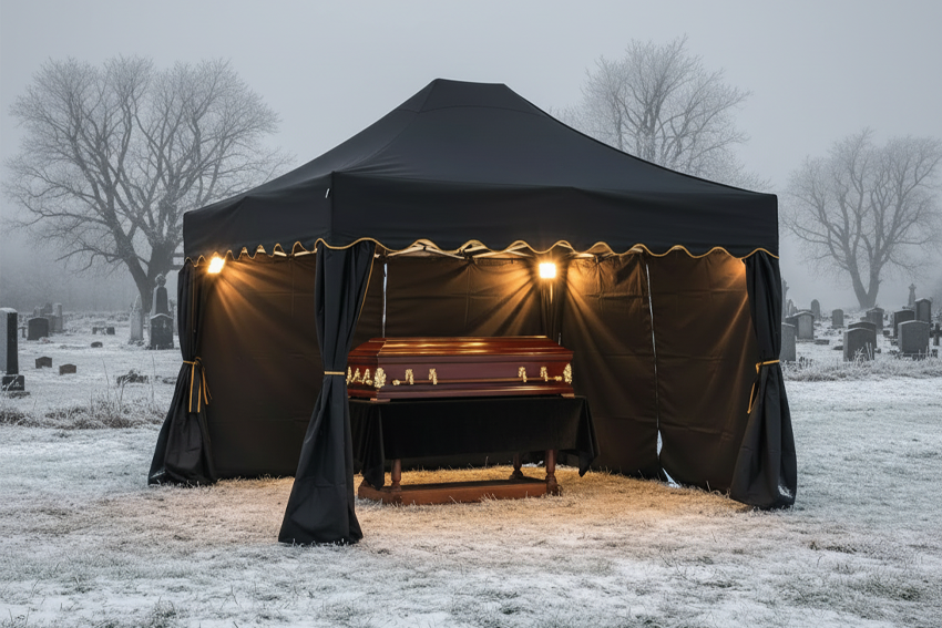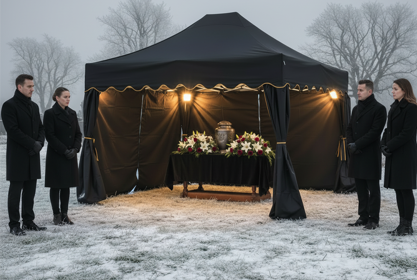 Although gloomy winter days are always characterized by reduced visibility, not every ceremony absolutely requires artificial lighting. Much depends on time of day and cloud intensity. Ceremonies taking place mid-day, between ten and one o'clock, even with completely cloudy sky, sometimes have sufficient diffused natural light to consider forgoing additional lighting, especially if the tent isn't too large and has a light-colored covering. However, the boundary between sufficient and insufficient light can be fluid and also depends on participants' personal comfort – elderly people may need more light to see well, especially on cloudy, gray winter days. In practice, most funeral homes prefer to be cautious and prepare lighting even in situations where theoretically they could do without it. Prepared lighting can be turned on at any moment if it proves necessary – for example when the winter sky suddenly clouds over even more or when heavy snow starts falling – and its absence in a situation when it suddenly becomes even darker can disturb the ceremony's progress. The principle of anticipation and preparation for different scenarios works better than ad hoc action at the last moment, especially in unpredictable winter weather conditions.