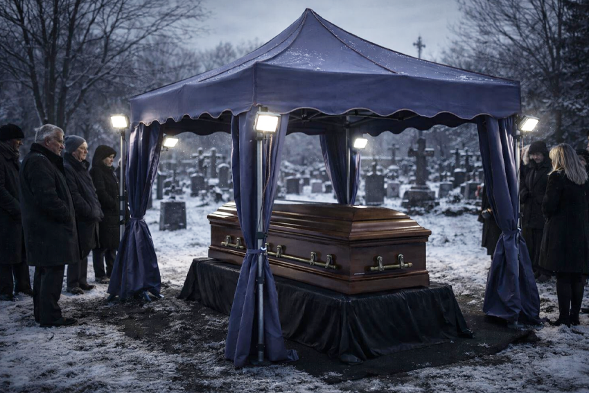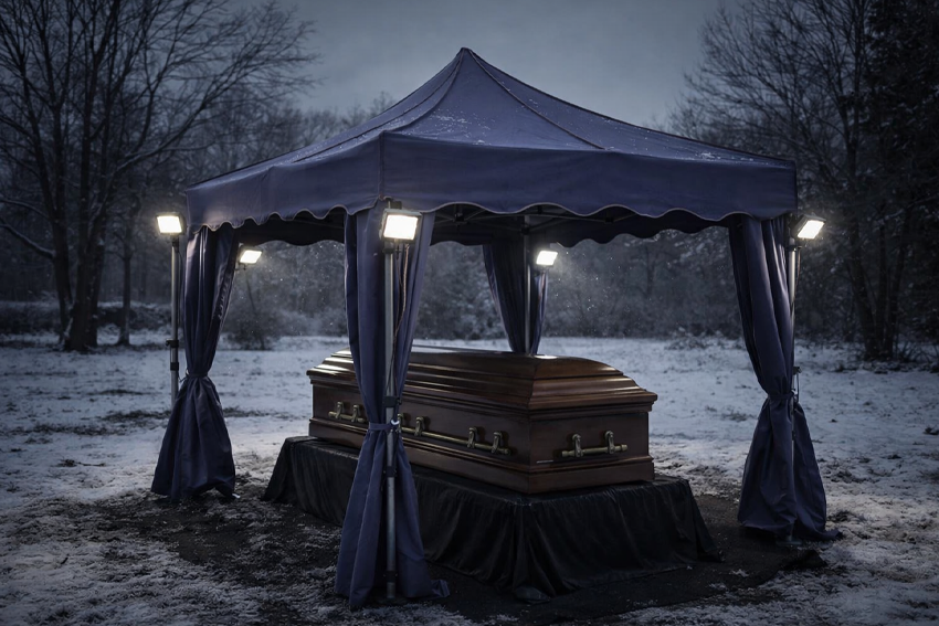 In such circumstances, the ceremonial tent serves not only as shelter from wind or precipitation but becomes a space requiring its own independent lighting. Under the tent roof, even in the theoretical middle of the day, natural light arrives in very limited quantities – the mosquito net or tarp material absorbs part of the already weak sunlight, the dark colors of the arranged space around the grave also don't favor light dispersion. For the priest conducting prayers, for the person delivering the farewell speech, for the family following every gesture of the ceremony, the ability to see details has emotional and symbolic meaning. Funeral liturgy contains many gestures that gain full meaning when visible – sprinkling with holy water, incensing, blessing. Dim light limits perception of these actions and can thereby diminish the sense of participation in the farewell.